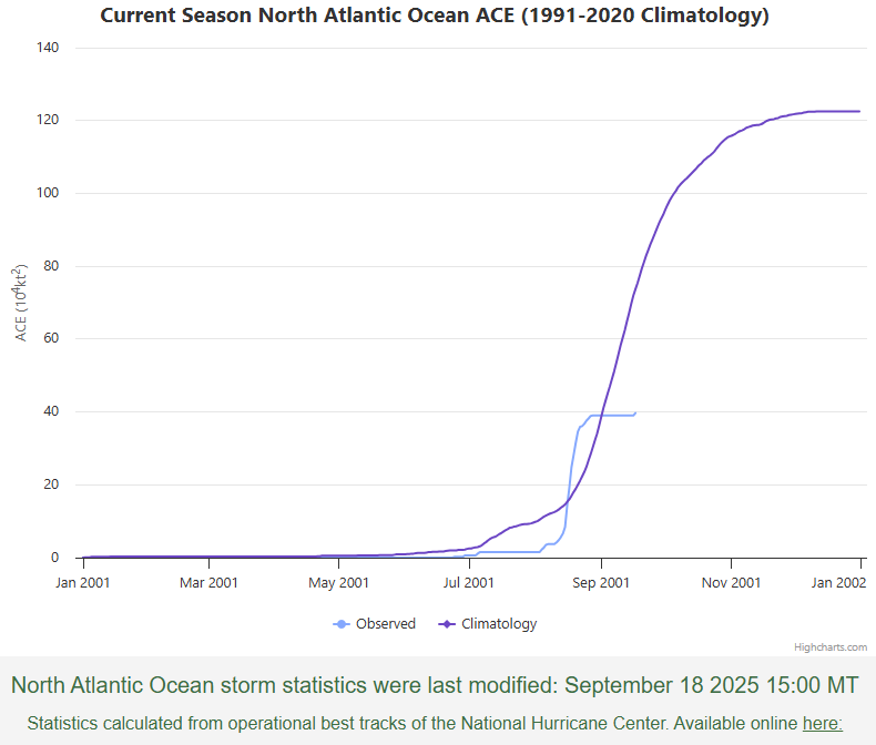 As noted elsewhere this week, Matthew Wielicki has posted an update on the very quiet 2025 hurricane season in which he makes reference to a website we ourselves have recommended, namely the Colorado State University Real Time Tropical Cyclone Tracker. Selecting the North Atlantic region opens a chart of Accumulated Cyclone Energy (ACE) to date, comparing the observed level to the long term regional average. ACE is, as the name implies, an index not merely of the number of named storms but of their total energy, thus creating an index of the overall severity of the storm season. Bearing in mind that 2025 was forecast to be an above-average storm season, it is remarkable to see the ACE index is now only half the level expected for a normal year at this point.