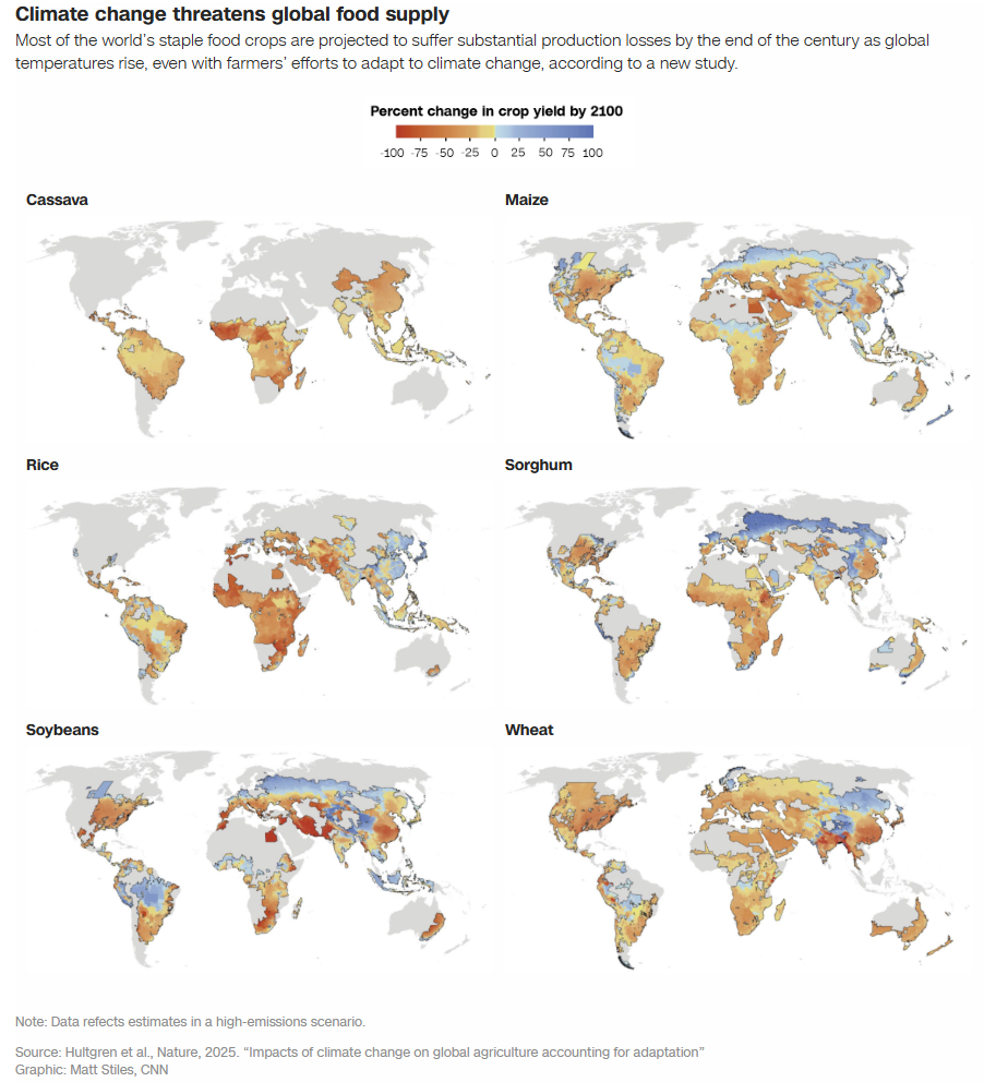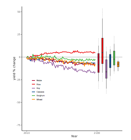 The crop labels are very small so you might need to squint. But the squiggly coloured lines show total yield changes caused by climate change over the 21st century and the associated coloured bars show the change as of 2100 with uncertainty ranges represented by the length of the thin lines.
