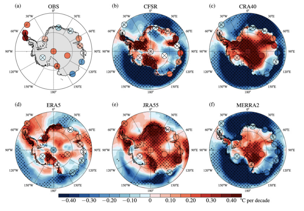 Last week’s paper was published in April 2025. You only had to wait until June 2025 to get the opposite findings in the form of this paper entitled “Recent warming trends in Antarctica revealed by multiple reanalysis”. Last week’s paper used satellite readings of surface heat to provide coverage where there are no surface weather stations. This week’s uses reanalysis systems to accomplish the same goal. A reanalysis system takes the dribs and drabs of data where the observations exist and feeds them into regional weather models that then generate forecasts to fill in data for the entire area. Then the system repeats the next day once again using the new incomplete observations. You can decide for yourself how reliable you think this system is. It’s probably pretty good in places where daily weather forecasts are reliable, and not so good elsewhere. Applied to Antarctica the results look like this: