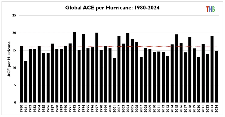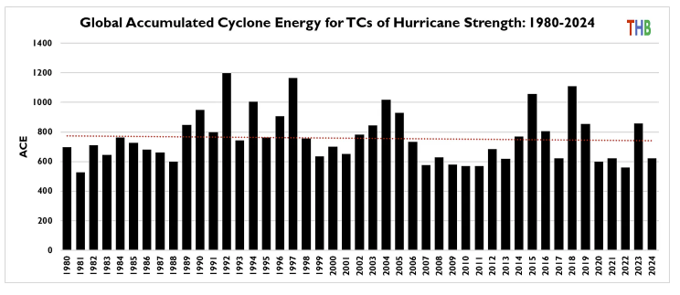 Roger Pielke Jr. marks the end of the 2025 hurricane season with a writeup and review. As we so often say, if it had gone the other way the climate crowd would have blamed greenhouse gases. But a quiet hurricane season is just weather. This time though the trouble goes deeper. Climate modelers don’t mind the idea that there may be fewer hurricanes in a warmer world, but they say that on average each one will be even stronger. So the energy per hurricane should be trending up even if the number of hurricanes is going down. Yeah, coulda woulda shoulda. But guess what.