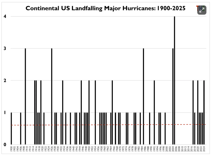 Hurricanes did hit the Caribbean, most notably Melissa which killed 100 people. But as for hurricanes hitting the U.S., 2025 was very disappointing, for those who find the absence of death and devastation a letdown. Here is the chart of major hurricane U.S. landfalls: