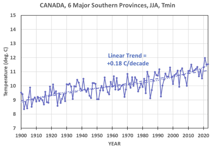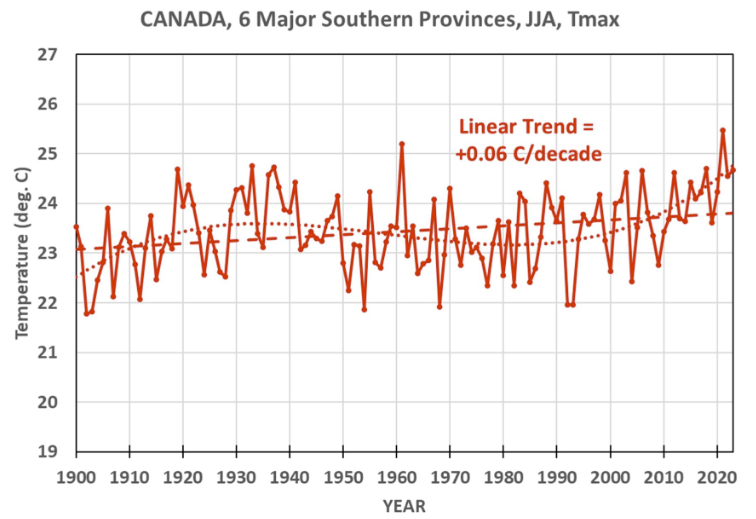 Or should we say lack thereof? Dr. Roy Spencer, of the Christy-Spencer satellite data set fame, has posted an analysis on his weblog of Canadian summertime (June, July and August) temperatures, namely daytime highs and nighttime lows, from southern locations across six provinces from 1900 to 2023. His analysis used the Canadian data in the Global Historical Climatology Network (GHCN) archive and the findings are very clear: nighttime lows trended up steadily across 124 years of the sample, but daytime highs did not. They followed a gentle cycle, peaking in the 1930s, falling through the 1980s then rising again afterwards: