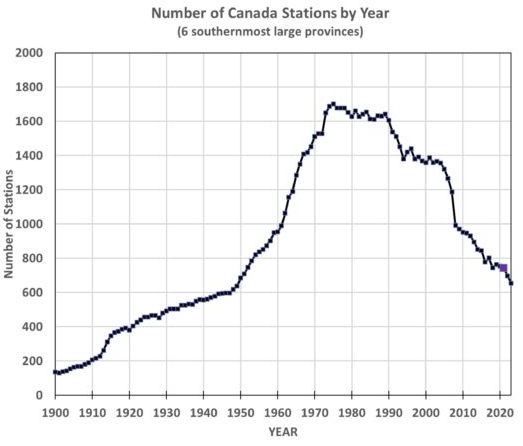 The data cover BC, Alberta, Saskatchewan, Manitoba, Ontario and Quebec. And here’s something else really weird. The number of weather stations in those six provinces has changed dramatically over time. In the last half-century, with rising concerns about climate that presumably create an urgent need for ample reliable data, it has… fallen sharply: