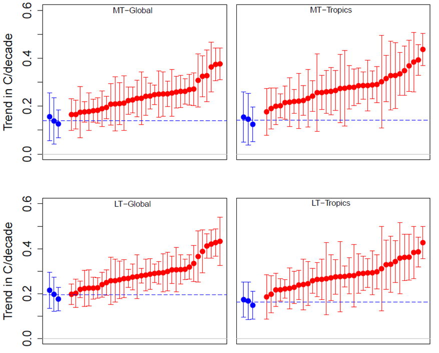 The models are in red and the observations are in blue, with each dot representing the trend in degrees C per decade since 1979. There are three blue dots because there are three observational systems: satellites, balloons and reanalysis (data from weather forecasting models), while the horde of red dots shows the predictions of 39 climate models. And there are four boxes because the top row shows mid-troposphere and the bottom row lower troposphere, while the left column shows the entire planet and the right column just the tropics (where the models say warming should be strongest):