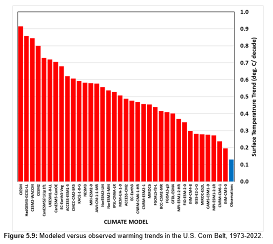 Finally the “red team” present some data on the U.S. Corn Belt. Since the effect of climate change on agriculture is a big topic in some circles, they compared model reconstructions of warming over 1973 to 2022 versus what was actually observed. And (drum roll please ...) once again the models went hysterical: