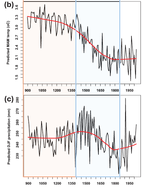 The authors also used the pollen record to reconstruct temperatures and precipitation. Here are the Spring (March-April-May, top panel) temperatures and the winter (December-January-February, bottom panel) precipitation records: