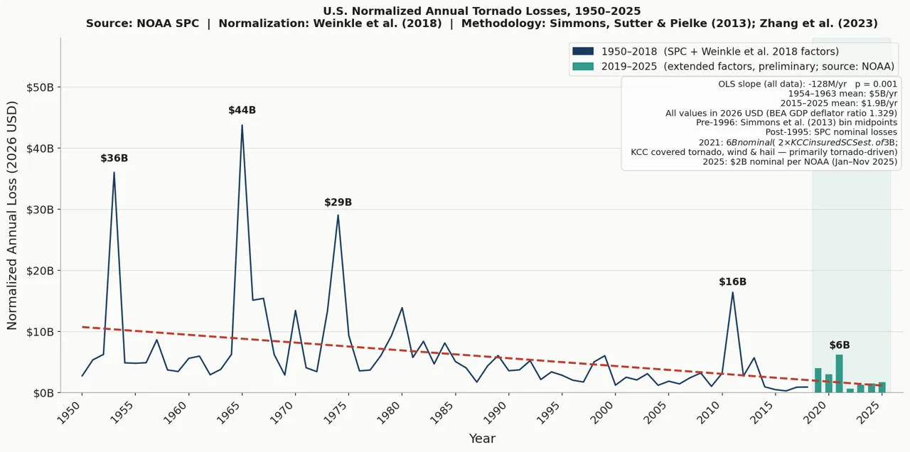 “The dominant loss years are 1954 ($36 billion),1965 ($44 billion), and 1974 ($29 billion). The largest recent loss year is 2011 at $16 billion – the largest post-1980 value and the only recent year approaching the scale of the 1960s-1970s peaks. Since 2012, annual normalized losses have largely remained below $5 billion. The time series shows a significant decrease in annual normalized losses. The 1954-1963 decade averaged $4.8 billion per year; the 2015–2025 decade averaged $1.9 billion per year.”