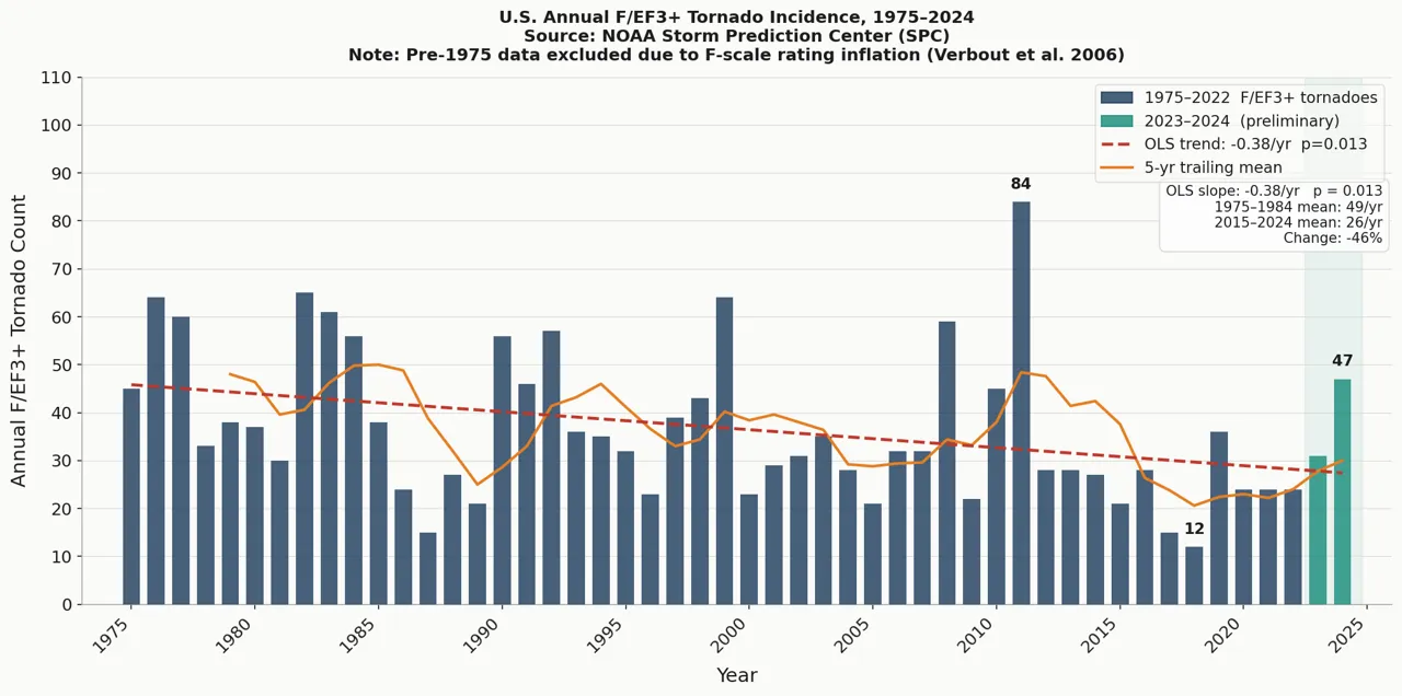 Focusing on the strongest tornadoes is important because prior to the deployment of Dopppler radar in the 1970s many small tornadoes were never recorded if they happened in rural areas and no one was looking. But people tended to notice the major ones for fairly obvious reasons (like being blown from Kansas to Oz or worse) so the major-tornado time series is more comparable over time.