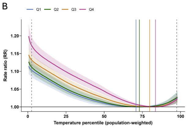 The horizontal axis shows temperature re-weighted to represent the local population exposure (so counties with fewer inhabitants don’t skew the result), then turned into a percentile scale from 1 to 100 (so that, for example, you can see that more than 75% of the population experiences temperatures lower than that associated with minimum mortality). The vertical axis shows the ratio of deaths at that temperature relative to those at 22.7 °C, which is where the curve bottoms out. The differently-coloured lines represent different levels of wealth, measured using something called a Social Vulnerability Index, so the lower your number the less vulnerable you are to various things including undesirable temperatures. So blue and green show death rates for the least vulnerable while yellow and pink show them for highest, which generally means the poorest and hence least able to act to mitigate undesirable situations.